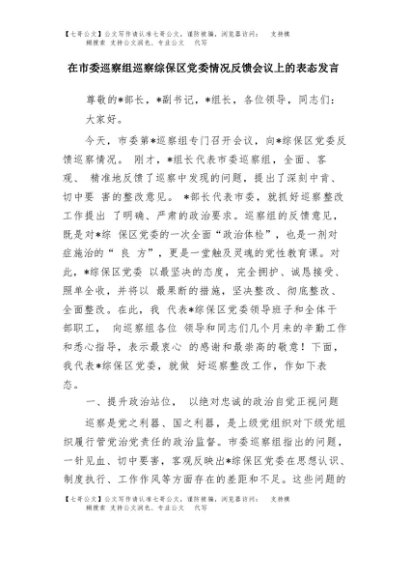 【七哥公文】2025年:在市委巡察组巡察综保区党委情况反馈会议上的表态发言+更多免费公文+VX:QiGeGongWen2024