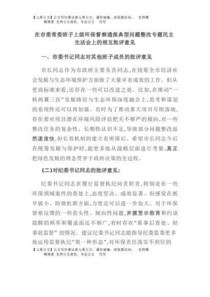【七哥公文】2025年:在市委常委班子上级环保督察通报典型问题整改专题民主生活会上的相互批评意见+更多免费公文+VX:QiGeGongWen2024