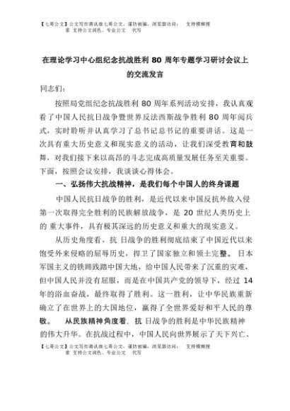 【七哥公文】2025年:在理论学习中心组纪念抗战胜利80周年专题学习研讨会议上的交流发言+更多免费公文+VX:QiGeGongWen2024