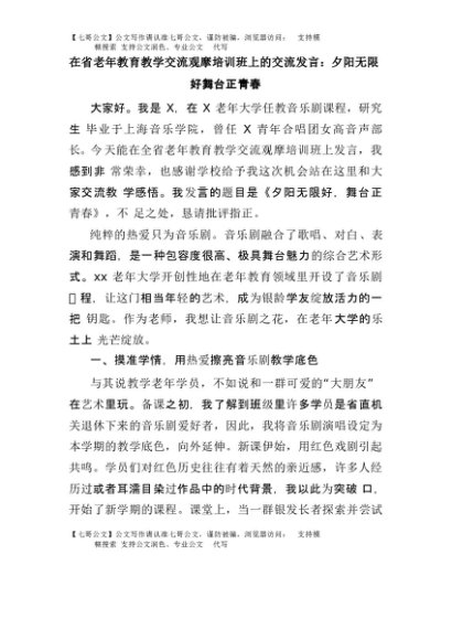 【七哥公文】2025年:在省老年教育教学交流观摩培训班上的交流发言:夕阳无限好舞台正青春+更多免费公文+VX:QiGeGongWen2024