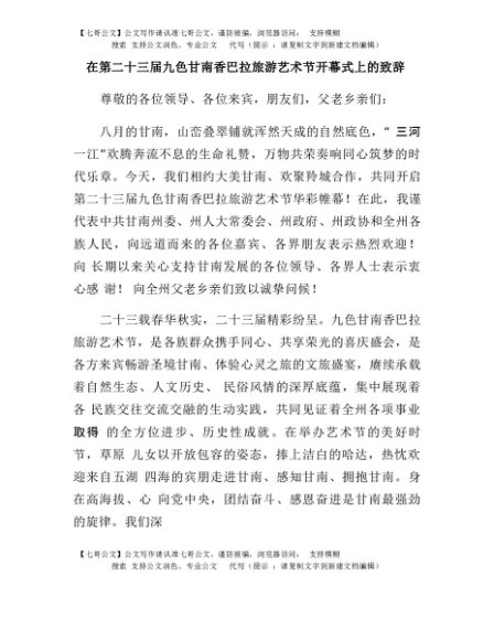 【七哥公文】2025年:在第二十三届九色甘南香巴拉旅游艺术节开幕式上的致辞+更多免费公文+VX:QiGeGongWen2024