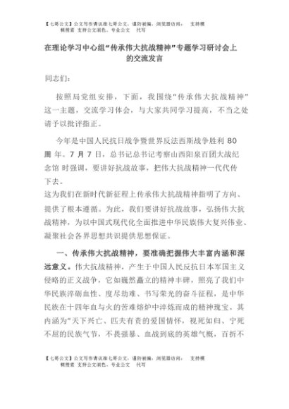 【七哥公文】2025年:在理论学习中心组“传承伟大抗战精神”专题学习研讨会上的交流发言+更多免费公文+VX:QiGeGongWen2024