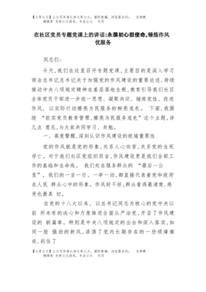 【七哥公文】2025年:在社区党员专题党课上的讲话:永葆初心担使命,锤炼作风优服务+更多免费公文+VX:QiGeGongWen2024