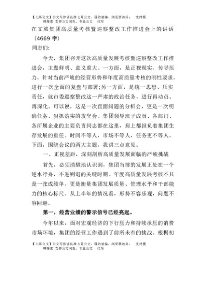 【七哥公文】2025年:在文旅集团高质量考核暨巡察整改工作推进会上的讲话(4669字)+更多免费公文+VX:QiGeGongWen2024