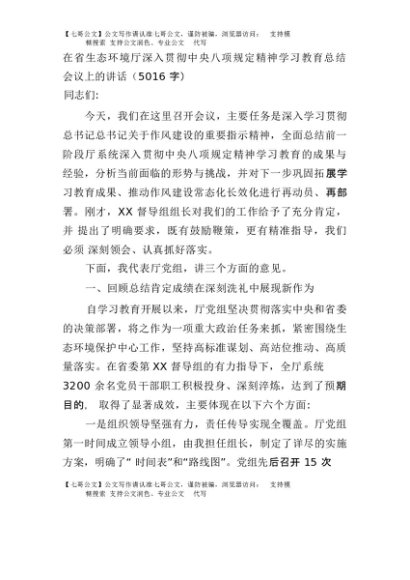 【七哥公文】2025年:在省生态环境厅深入贯彻中央八项规定精神学习教育总结会议上的讲话(5016字)+更多免费公文+VX:QiGeGongWen2024