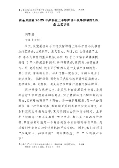 【七哥公文】2025年:在某卫生院2025年某科室上半年护理不良事件总结汇报会上的讲话+更多免费公文+VX:QiGeGongWen2024