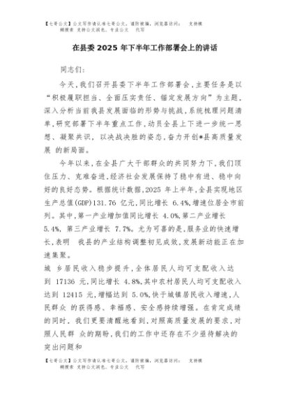 / 【七哥公文】2025年:在县委2025年下半年工作部署会上的讲话+更多免费公文+VX:QiGeGongWen2024