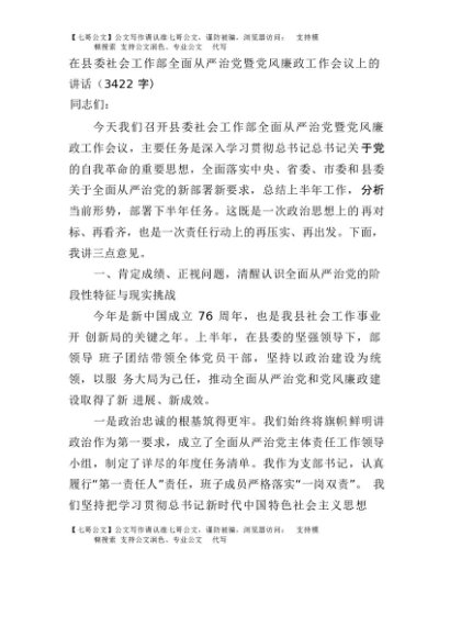 【七哥公文】2025年:在县委社会工作部全面从严治党暨党风廉政工作会议上的讲话(3422字)+更多免费公文+VX:QiGeGongWen2024