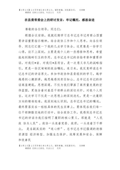 【七哥公文】2025年:在县委常委会上的研讨发言:牢记嘱托、感恩奋进+更多免费公文+VX:QiGeGongWen2024