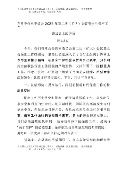 【七哥公文】2025年:在县委保密委员会2025年第二次(扩大)会议暨全县保密工作推进会上的讲话+更多免费公文+VX:QiGeGongWen2024