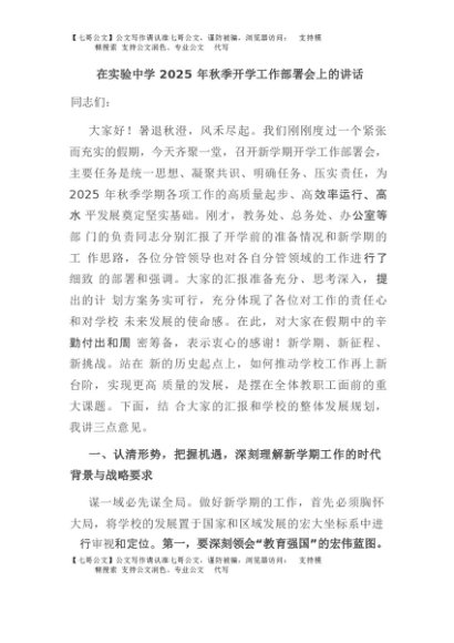 / 【七哥公文】2025年:在实验中学2025年秋季开学工作部署会上的讲话+更多免费公文+VX:QiGeGongWen2024