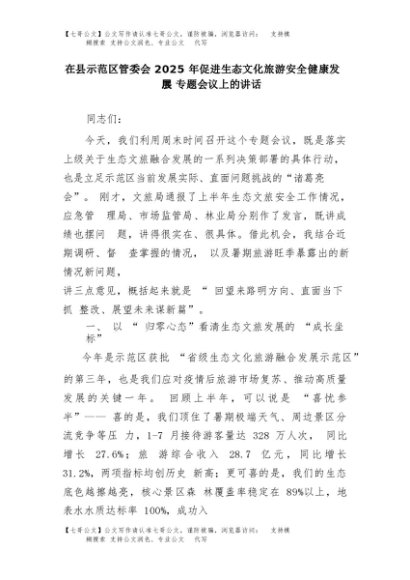 【七哥公文】2025年:在县示范区管委会2025年促进生态文化旅游安全健康发展专题会议上的讲话+更多免费公文+VX:QiGeGongWen2024