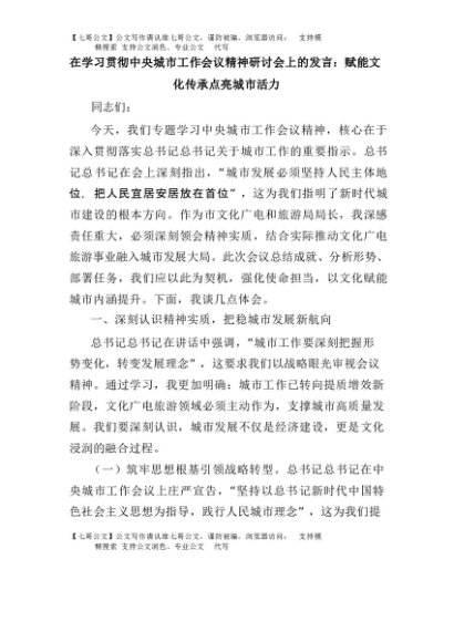 【七哥公文】2025年:在学习贯彻中央城市工作会议精神研讨会上的发言:赋能文化传承点亮城市活力+更多免费公文+VX:QiGeGongWen2024
