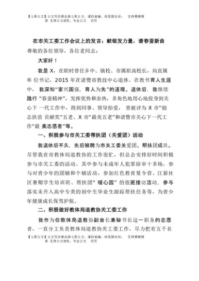 【七哥公文】2025年:在市关工委工作会议上的发言:献银发力量,谱春蚕新曲+更多免费公文+VX:QiGeGongWen2024