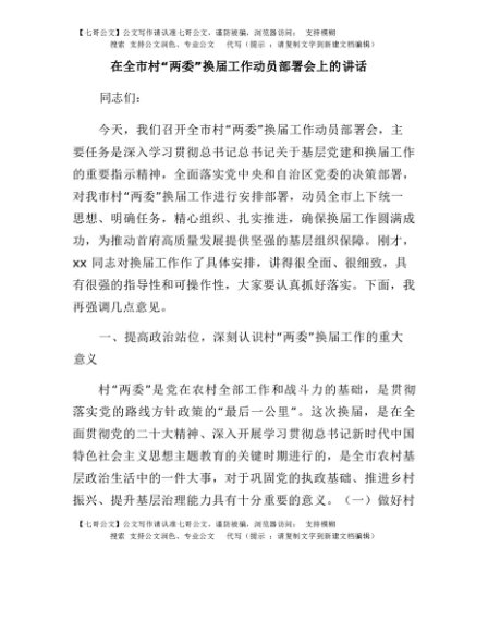 / 【七哥公文】2025年:在全市村“两委”换届工作动员部署会上的讲话+更多免费公文+VX:QiGeGongWen2024