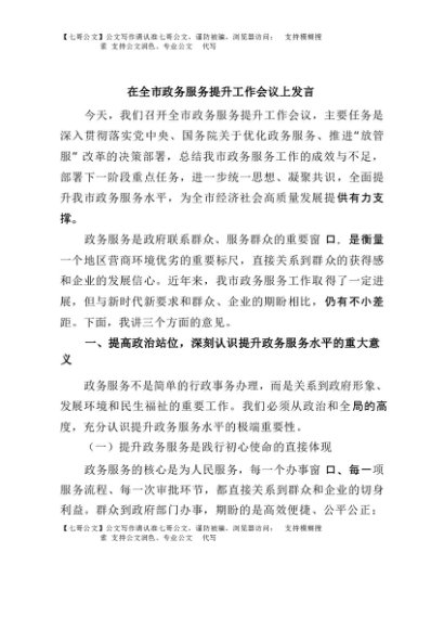/ 【七哥公文】2025年:在全市政务服务提升工作会议上发言+更多免费公文+VX:QiGeGongWen2024