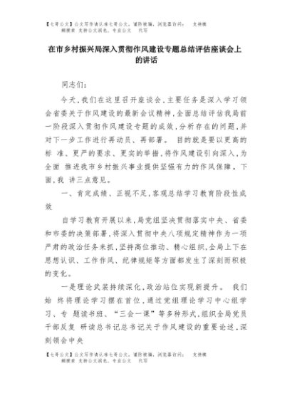 【七哥公文】2025年:在市乡村振兴局深入贯彻作风建设专题总结评估座谈会上的讲话+更多免费公文+VX:QiGeGongWen2024