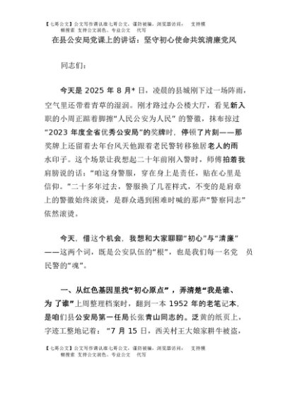 / 【七哥公文】2025年:在县公安局党课上的讲话:坚守初心使命共筑清廉党风+更多免费公文+VX:QiGeGongWen2024