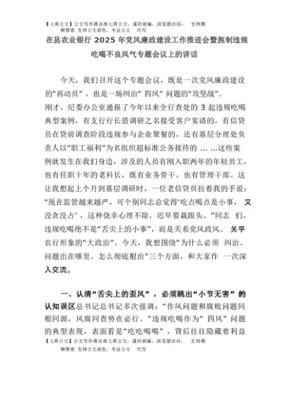 【七哥公文】2025年:在县农业银行2025年党风廉政建设工作推进会暨扼制违规吃喝不良风气专题会议上的讲话+更多免费公文+VX:QiGeGongWen2024