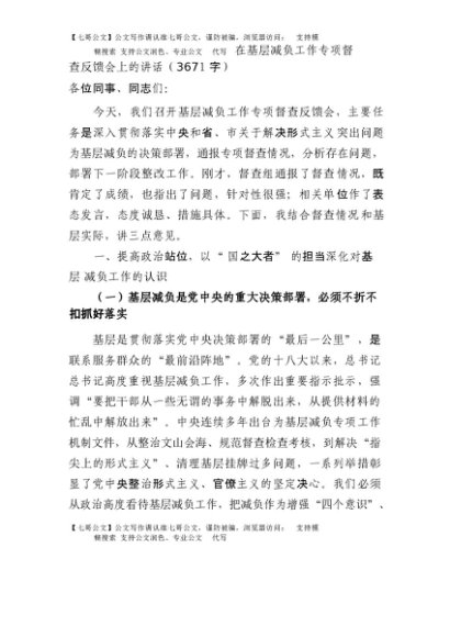 【七哥公文】2025年:在基层减负工作专项督查反馈会上的讲话(3671字)+更多免费公文+VX:QiGeGongWen2024