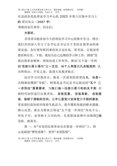 【七哥公文】2025年:在县政协党组理论学习中心组2025年第六次集中学习上的研讨发言(2687字)+更多免费公文+VX:QiGeGongWen2024