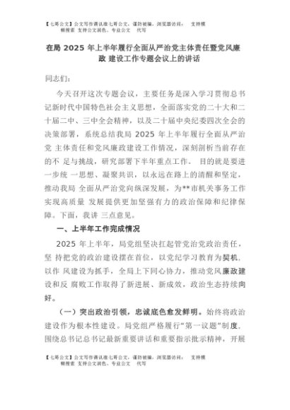 【七哥公文】2025年:在局2025年上半年履行全面从严治党主体责任暨党风廉政建设工作专题会议上的讲话+更多免费公文+VX:QiGeGongWen2024