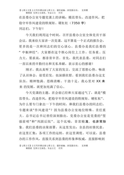 【七哥公文】2025年:在县委办公室专题党课上的讲稿:模范带头、改进作风,把稳守牢作风建设的铁规矩、硬杠杠(7350字)+更多免费公文+VX:QiGeGongWen2024
