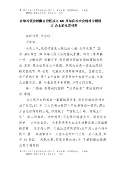 【七哥公文】2025年:在学习领会西藏自治区成立60周年庆祝大会精神专题研讨会上的发言材料+更多免费公文+VX:QiGeGongWen2024