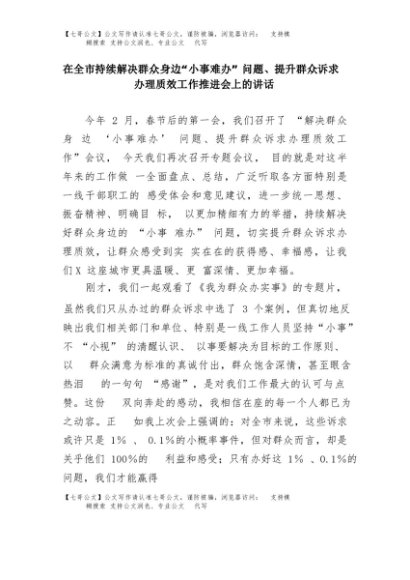 【七哥公文】2025年:在全市持续解决群众身边“小事难办”问题、提升群众诉求办理质效工作推进会上的讲话+更多免费公文+VX:QiGeGongWen2024