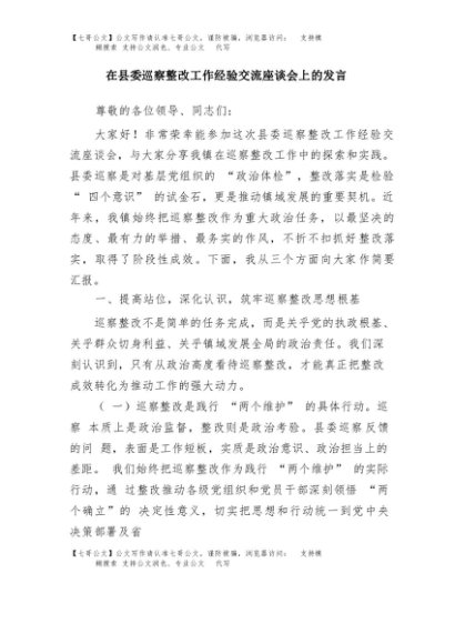 / 【七哥公文】2025年:在县委巡察整改工作经验交流座谈会上的发言+更多免费公文+VX:QiGeGongWen2024