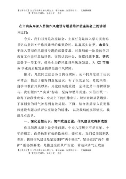 【七哥公文】2025年:在市商务局深入贯彻作风建设专题总结评估座谈会上的讲话+更多免费公文+VX:QiGeGongWen2024