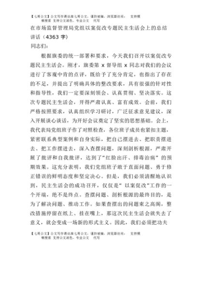 【七哥公文】2025年:在市场监督管理局党组以案促改专题民主生活会上的总结讲话(4363字)+更多免费公文+VX:QiGeGongWen2024