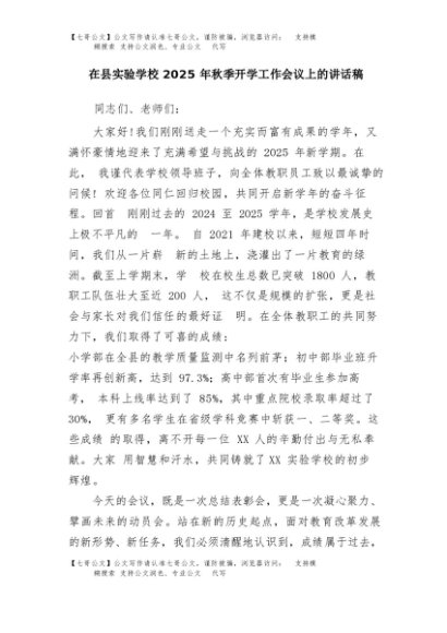 【七哥公文】2025年:在县实验学校2025年秋季开学工作会议上的讲话稿+更多免费公文+VX:QiGeGongWen2024