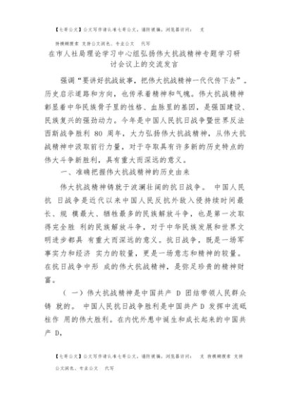 【七哥公文】2025年:在市人社局理论学习中心组弘扬伟大抗战精神专题学习研讨会议上的交流发言+更多免费公文+VX:QiGeGongWen2024