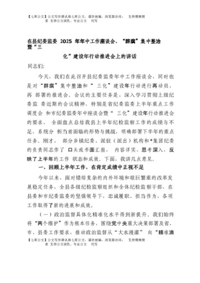【七哥公文】2025年:在县纪委监委2025年年中工作座谈会、“群腐”集中整治暨“三化”建设年行动推进会上的讲话+更多免费公文+VX:QiGeGongWen2024
