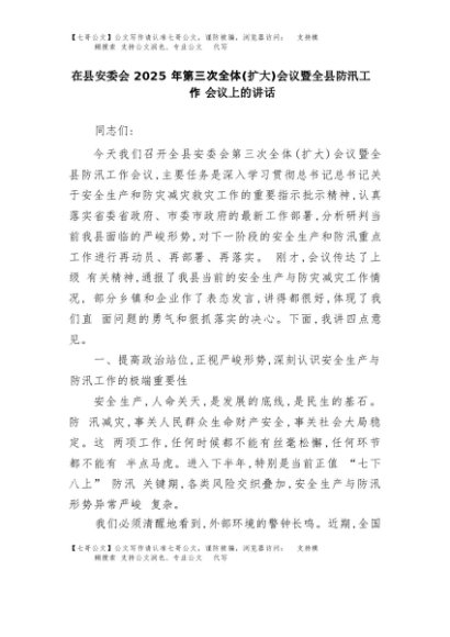 【七哥公文】2025年:在县安委会2025年第三次全体(扩大)会议暨全县防汛工作会议上的讲话+更多免费公文+VX:QiGeGongWen2024