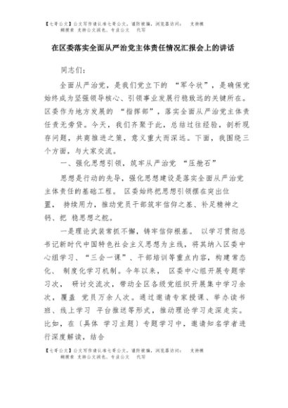 【七哥公文】2025年:在区委落实全面从严治党主体责任情况汇报会上的讲话+更多免费公文+VX:QiGeGongWen2024