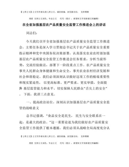 【七哥公文】2025年:在全省加强基层农产品质量安全监管工作推进会上的讲话+更多免费公文+VX:QiGeGongWen2024