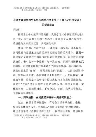 【七哥公文】2025年:在区委理论学习中心组专题学习会上关于《总书记经济文选》的研讨发言+更多免费公文+VX:QiGeGongWen2024