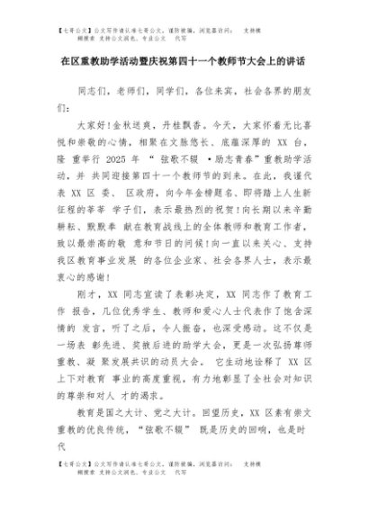【七哥公文】2025年:在区重教助学活动暨庆祝第四十一个教师节大会上的讲话+更多免费公文+VX:QiGeGongWen2024