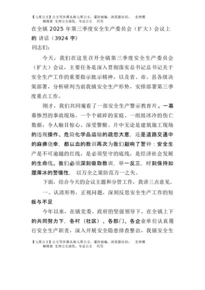 【七哥公文】2025年:在全镇2025年第三季度安全生产委员会(扩大)会议上的讲话(3924字)+更多免费公文+VX:QiGeGongWen2024
