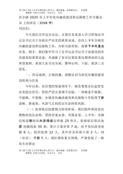 【七哥公文】2025年:在全镇2025年上半年党风廉政建设和反腐败工作专题会议上的讲话(3268字)+更多免费公文+VX:QiGeGongWen2024