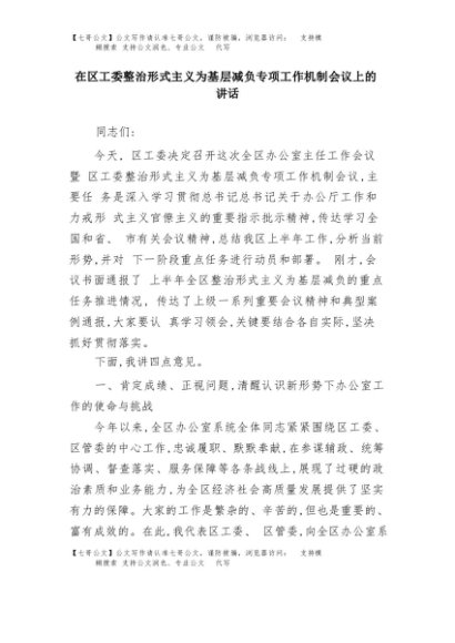 【七哥公文】2025年:在区工委整治形式主义为基层减负专项工作机制会议上的讲话+更多免费公文+VX:QiGeGongWen2024