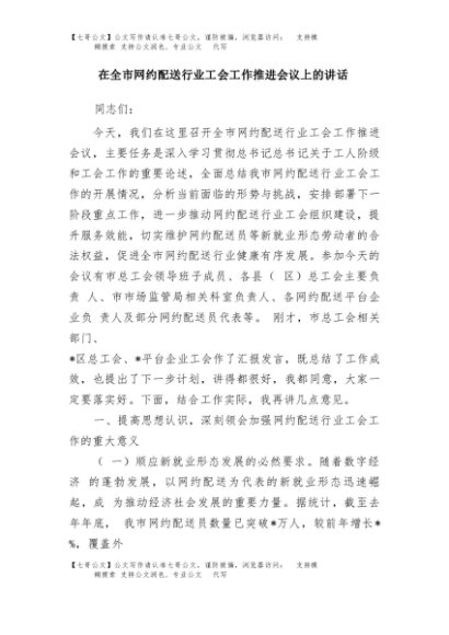 / 【七哥公文】2025年:在全市网约配送行业工会工作推进会议上的讲话+更多免费公文+VX:QiGeGongWen2024