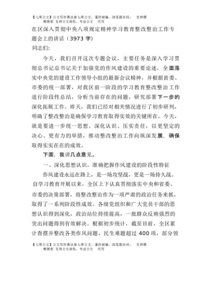 【七哥公文】2025年:在区深入贯彻中央八项规定精神学习教育整改整治工作专题会上的讲话(3973字)+更多免费公文+VX:QiGeGongWen2024
