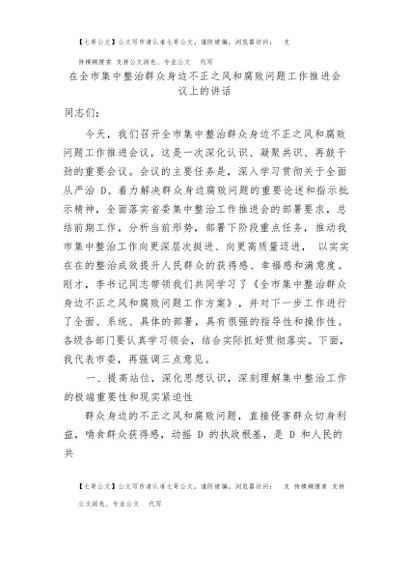 【七哥公文】2025年:在全市集中整治群众身边不正之风和腐败问题工作推进会议上的讲话+更多免费公文+VX:QiGeGongWen2024