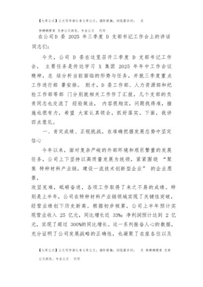 【七哥公文】2025年:在公司党委2025年三季度党支部书记工作会上的讲话+更多免费公文+VX:QiGeGongWen2024