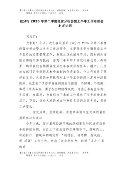 【七哥公文】2025年:在分行2025年第二季度经营分析会暨上半年工作总结会上的讲话+更多免费公文+VX:QiGeGongWen2024
