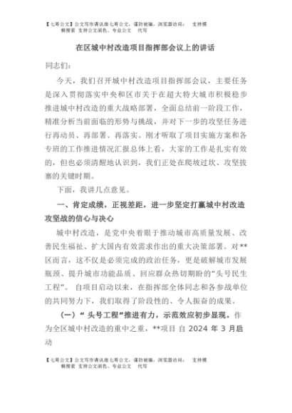 / 【七哥公文】2025年:在区城中村改造项目指挥部会议上的讲话+更多免费公文+VX:QiGeGongWen2024