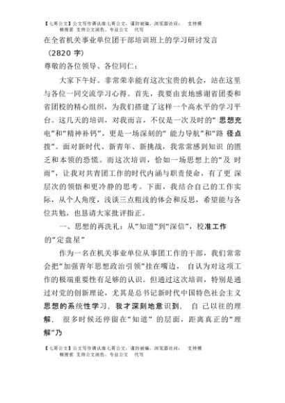 【七哥公文】2025年:在全省机关事业单位团干部培训班上的学习研讨发言(2820字)+更多免费公文+VX:QiGeGongWen2024